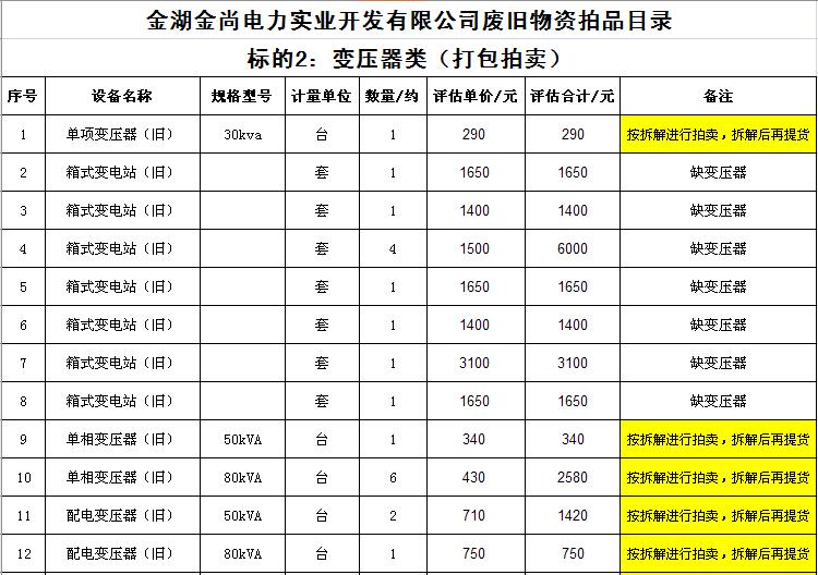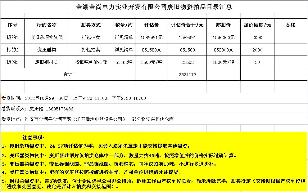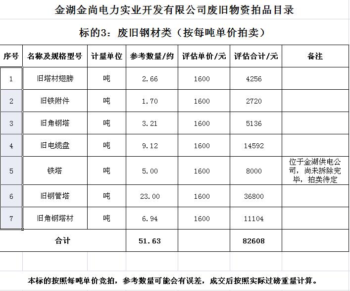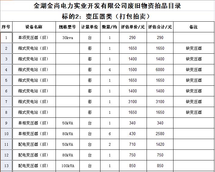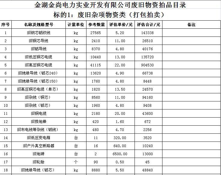 關(guān)注微信公眾號(hào)受金湖金尚電力實(shí)業(yè)開發(fā)有限公司委托,我公司將通過中國(guó)拍賣行業(yè)協(xié)會(huì)網(wǎng)絡(luò)拍賣平臺(tái)以網(wǎng)絡(luò)競(jìng)價(jià)的方式公開拍賣廢舊物資一批,主要包括:電纜、導(dǎo)線、鋼芯鋁絞線、角鋼塔、鐵附件、金具、變壓器、箱式變電站、空調(diào)、電腦等(詳見拍品目錄)。