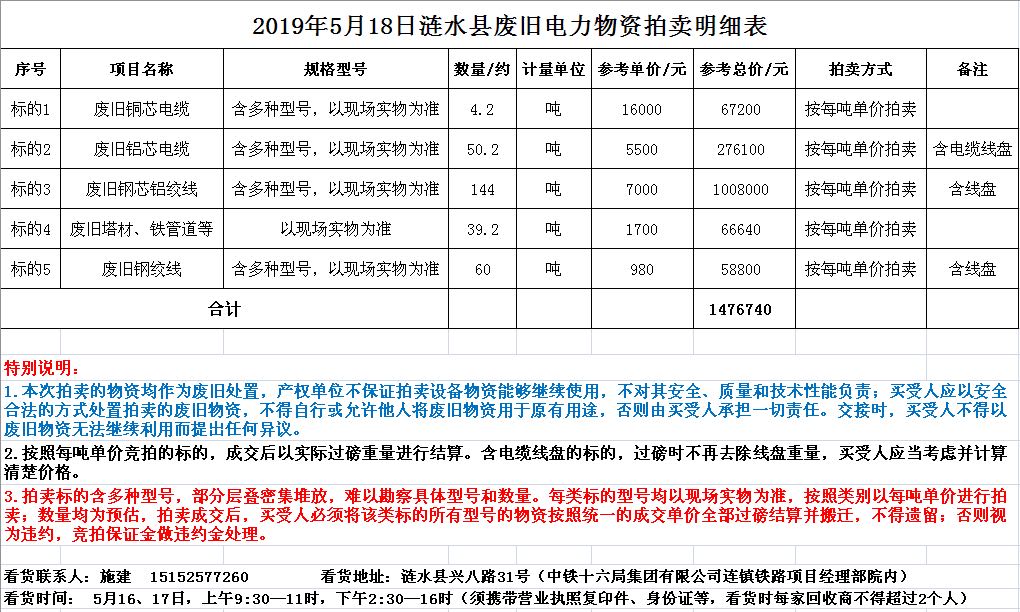 關(guān)注微信公眾號受委托,我公司將通過中國拍賣行業(yè)協(xié)會網(wǎng)絡(luò)拍賣平臺以網(wǎng)絡(luò)競價的方式公開拍賣以下廢舊電力物資,主要包括:銅芯電纜、鋁芯電纜、鋼芯鋁絞線、鋼絞線、角鋼塔等。