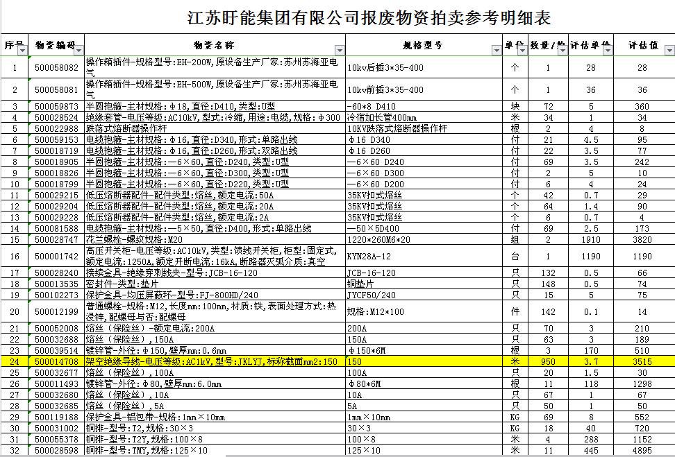 關注微信公眾號受江蘇盱能集團有限公司委托,我公司將通過中國拍賣行業(yè)協(xié)會網(wǎng)絡拍賣平臺以網(wǎng)絡競價的方式公開拍賣以下廢舊物資,主要包括:各型廢舊電纜、變壓器拆解件、五金、金具、鋼芯鋁絞線、開關、配電柜等。
