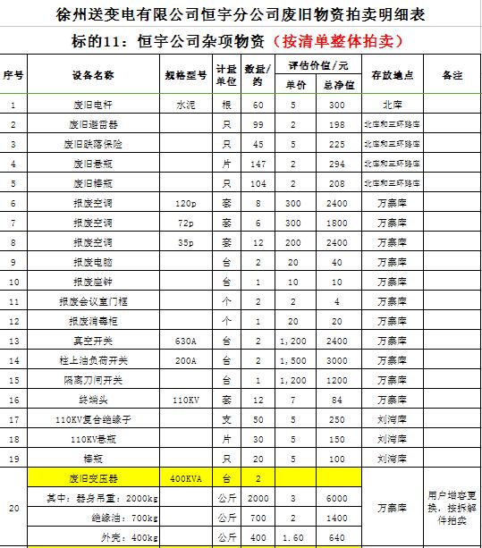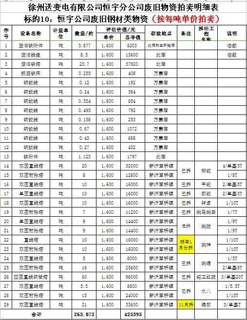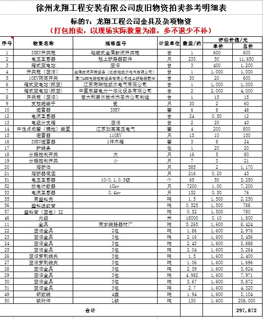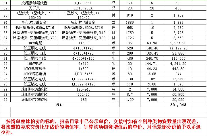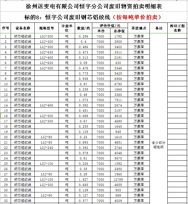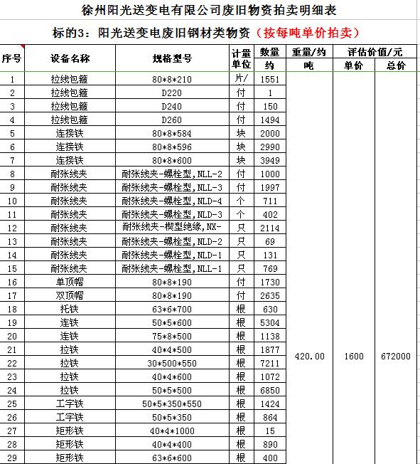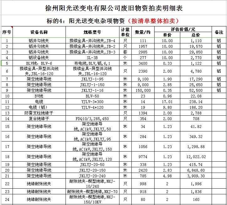 關(guān)注微信公眾號(hào)受委托,我公司將通過中國拍賣行業(yè)協(xié)會(huì)網(wǎng)絡(luò)拍賣平臺(tái)以網(wǎng)絡(luò)競(jìng)價(jià)的方式公開拍賣以下公司廢舊電力物資。主要包含:廢銅排下腳料、廢不銹鋼、辦公設(shè)備等;架空絕緣導(dǎo)線、電纜、金具、角鋼塔、鋼芯鋁絞線、開關(guān)、互感器、變壓器散件等。