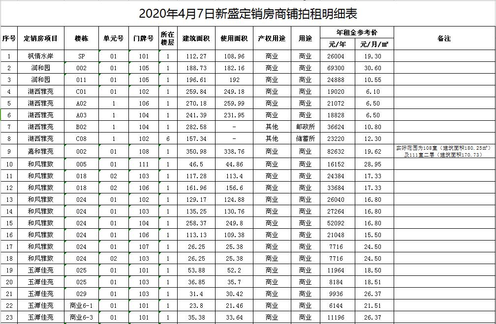楓情水岸、潤和園、湖西雅苑、嘉和雅苑、和風雅致、玉潭佳苑、文欣花園等。拍租商鋪約43套,均為空房,面積分別為數(shù)十至數(shù)百平米不等。租期3年。
