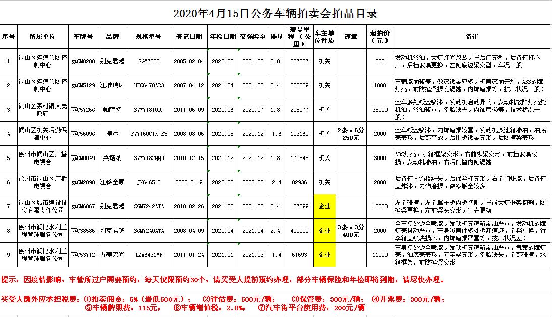 關注微信公眾號受委托,我公司定于2020年4月15日13:30時在徐州市銀地二手車交易市場四樓東南拍賣大廳通過現(xiàn)場和汽車街網(wǎng)絡拍賣平臺同步進行的方式公開拍賣以下車輛:①05年蘇CM0288君越;②07年蘇CM5129江淮瑞風;③11年蘇C5726G帕薩特;④10年蘇CM6067君越;⑤08年蘇C38586君越;⑥11年蘇C53712五菱宏光;⑦08年蘇C5609G捷達;⑧10年蘇CM0049桑塔納;⑨05年蘇CM2898江鈴全順。