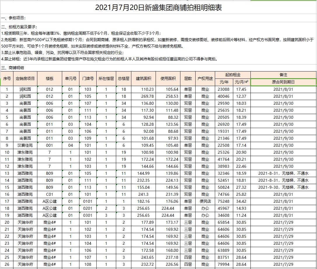 即日起展示。有意者請(qǐng)持有效證件至我公司報(bào)名,并交納每間商鋪1萬元保證金即可參拍,報(bào)名截止至7月19日16時(shí)。
