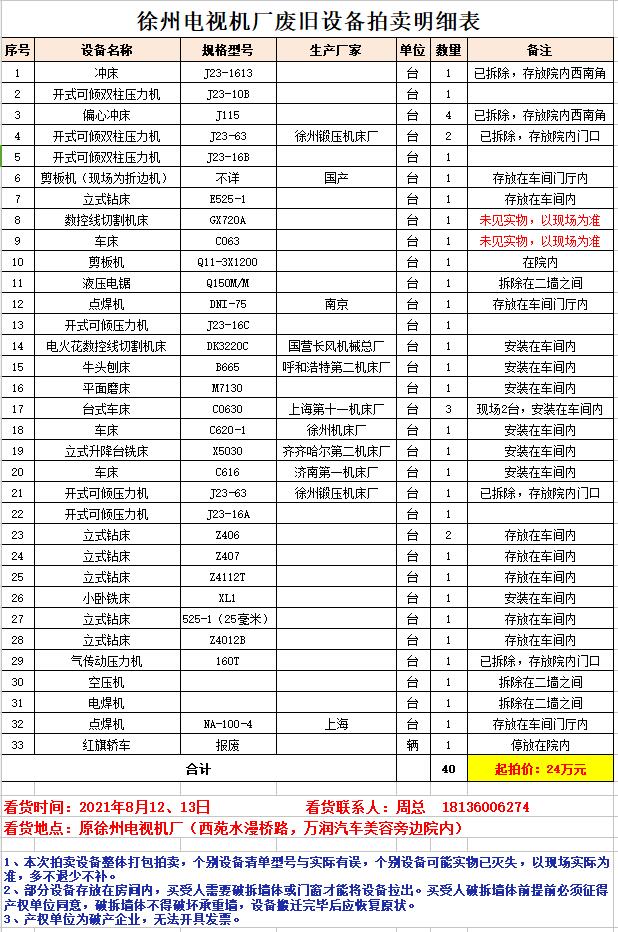 1、徐州電視機廠廢舊設備一批。包含:沖床、壓力機、折邊機、鉆床、機床、車床、刨床、磨床、銑床等、空壓機、電焊機等。(競買人須為具有再生資源回收資質(zhì)的企業(yè)法人),保證金5萬元。